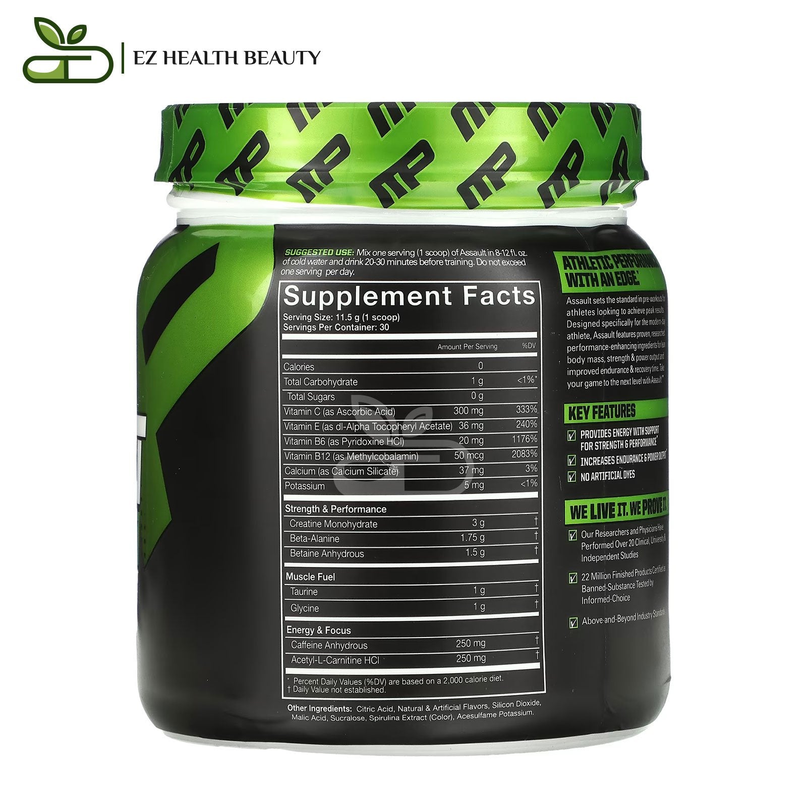 Musclepharm Assault Energy Extra Strength sets the standard for working out athletes looking to achieve optimal results, designed for modern athletes. Assault features proven and researched performance-enhancing ingredients to build lean body mass and produce a powder to boost strength, improve stamina, and improve recovery time. Take your game to the next level with Assault!