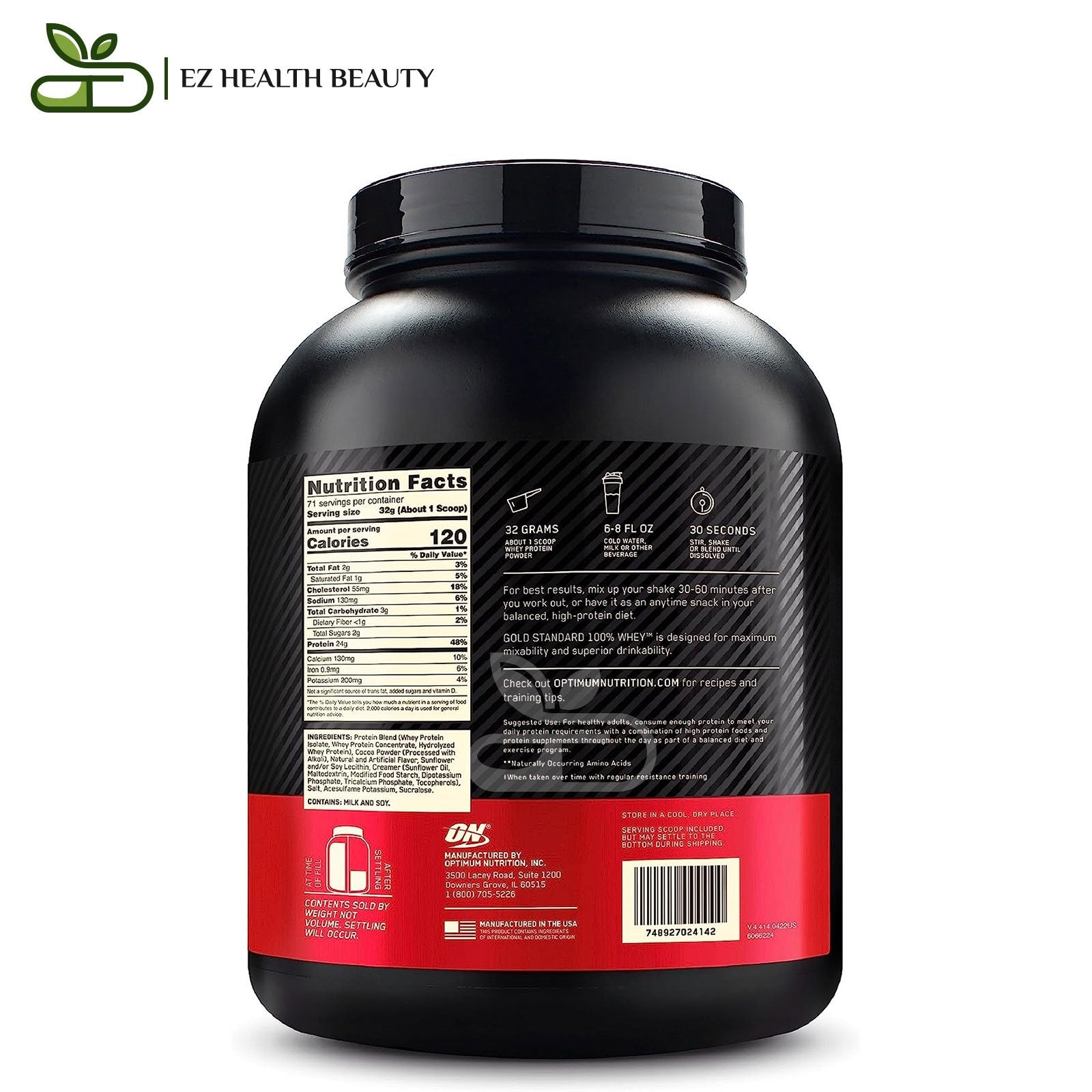 Please mix 1 scoop with 6 ounces or mix 2 scoops with 236 to 354 mL of cold water or skim milk in a glass or shaker cup, and it is recommended to take it between main meals and before and after exercise.Ingredients of Supplement Gold Standard Whey